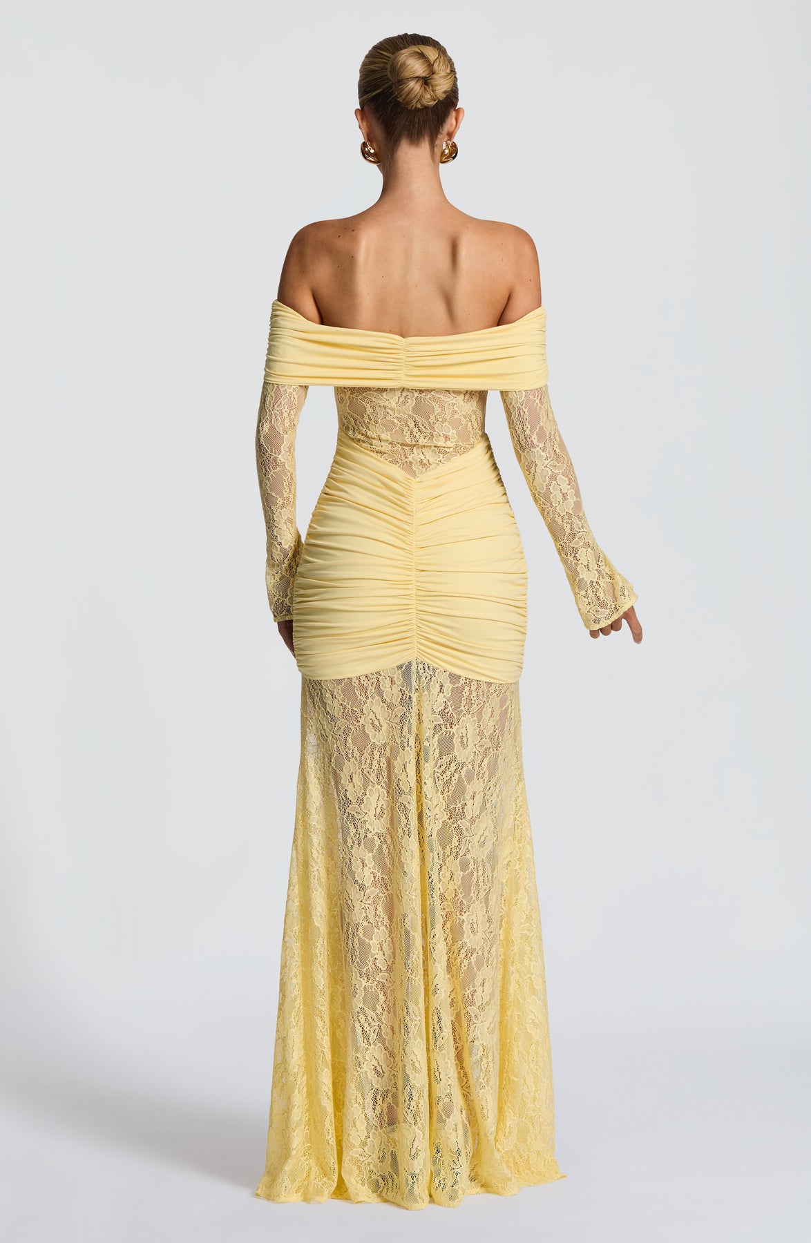 Crafted in a soft lemon hue, this gown fuses delicate sheer lace with sculpting stretch jersey, embracing your curves with a flawless fit. The intricate floral lace panels trace the arms, waist, and legs, creating a romantic contrast against the sleek, body-contouring base.